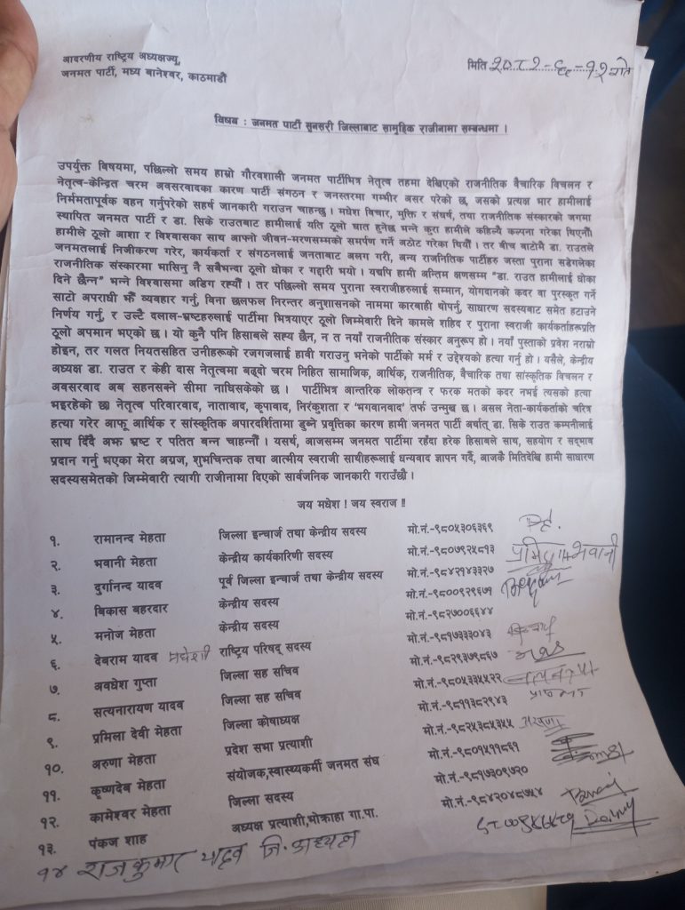 जनमत पार्टीको सुनसरी जिल्ला तथा केही केन्द्रिय पदाधिकारीले दिए सामुहिक राजीनामा