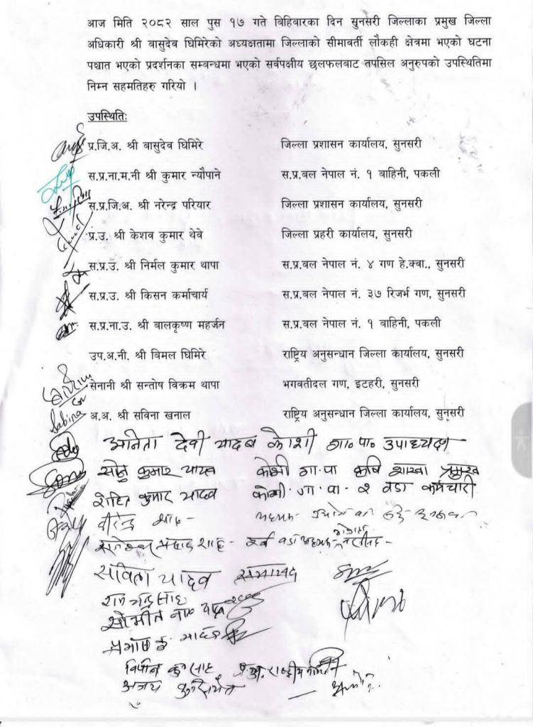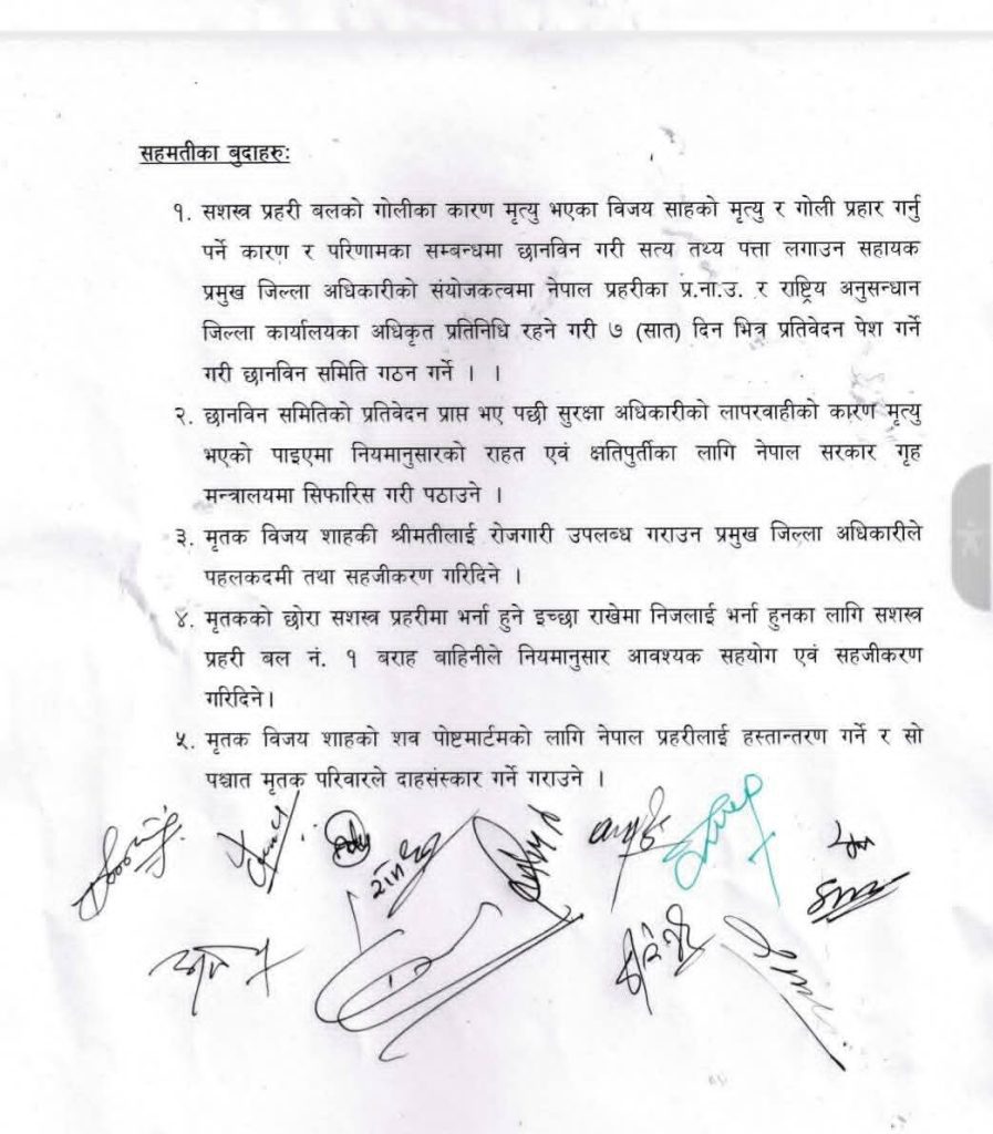 प्रजिअ घिमिरे सहितको उपस्थितिमा विहीबार दिउसो भएको सर्वपक्षीय सहमतिमा सशस्त्र प्रहरी बलको गोलीका कारण मृत्यु भएका विजय साहको मृत्यु र गोली प्रहार गर्नुपर्ने कारण र परिणामका सम्बन्धमा छानविन गरी सत्य तथ्य पत्ता लगाउन सहायक प्रमुख जिल्ला अधिकारीको संयोजकत्वमा नेपाल प्रहरी र राष्ट्रिय अनुसन्धान जिल्ला कार्यालयका अधिकृत प्रतिनिधि रहने गरी ७ (सात) दिन भित्र प्रतिवेदन पेश गर्ने गरी छानविन समिति गठन गर्ने उल्लेख गरिएको छ । छानविन समितिको प्रतिवेदन प्राप्त भएपछि सुरक्षा अधिकारीको लापरवाहीको कारण मृत्यु भएको पाइएमा नियमानुसारको राहत एवं क्षतिपुर्तीका लागि नेपाल सरकार गृह मन्त्रालयमा सिफारिस गरी पठाउने, मृतक विजय शाहकी श्रीमतीलाई रोजगारी उपलब्ध गराउन प्रमुख जिल्ला अधिकारीले पहलकदमी तथा सहजीकरण गरिदिने सहमती जुटेको हो ।